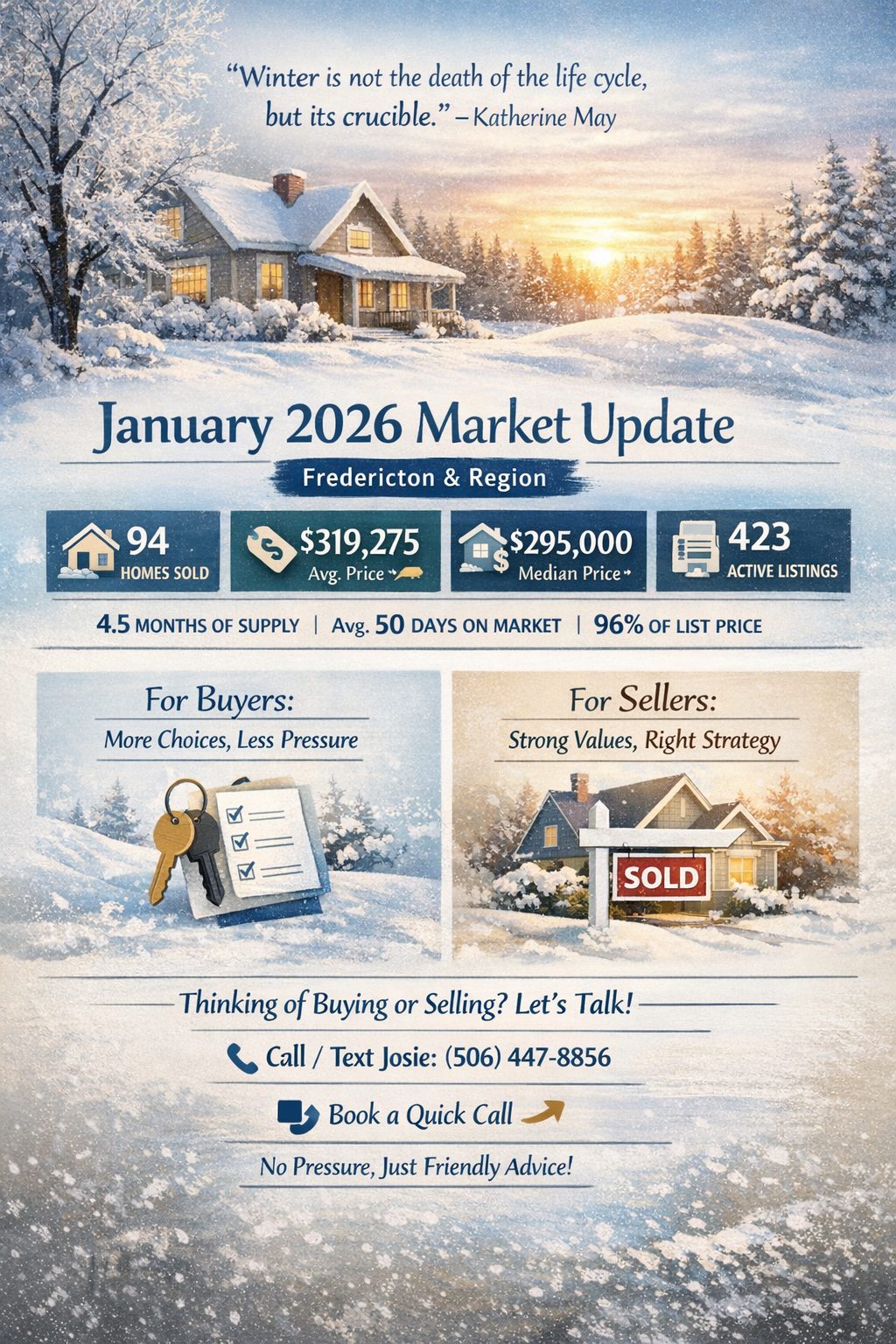 January gave us a clear picture of how the Fredericton & Region real estate market is shaping up as we move into 2026 🏡. We saw 94 homes sold, with an average price of $319,275 and a median price of $295,000. Inventory continues to build, with 423 active listings and about 4.5 months of supply, giving buyers more options and a bit more breathing room 😊. Homes are taking slightly longer to sell at around 50 days, and are closing at roughly 96% of list price, pointing to a more balanced and steady market 📊.